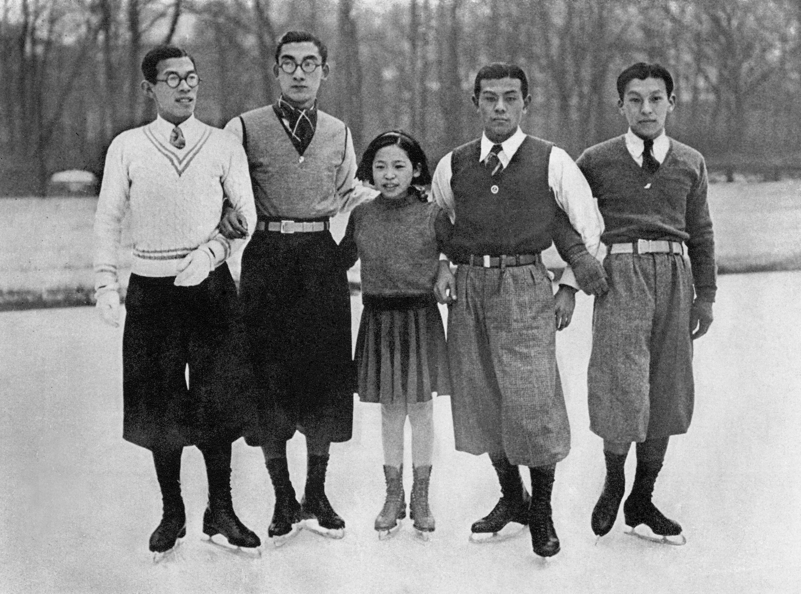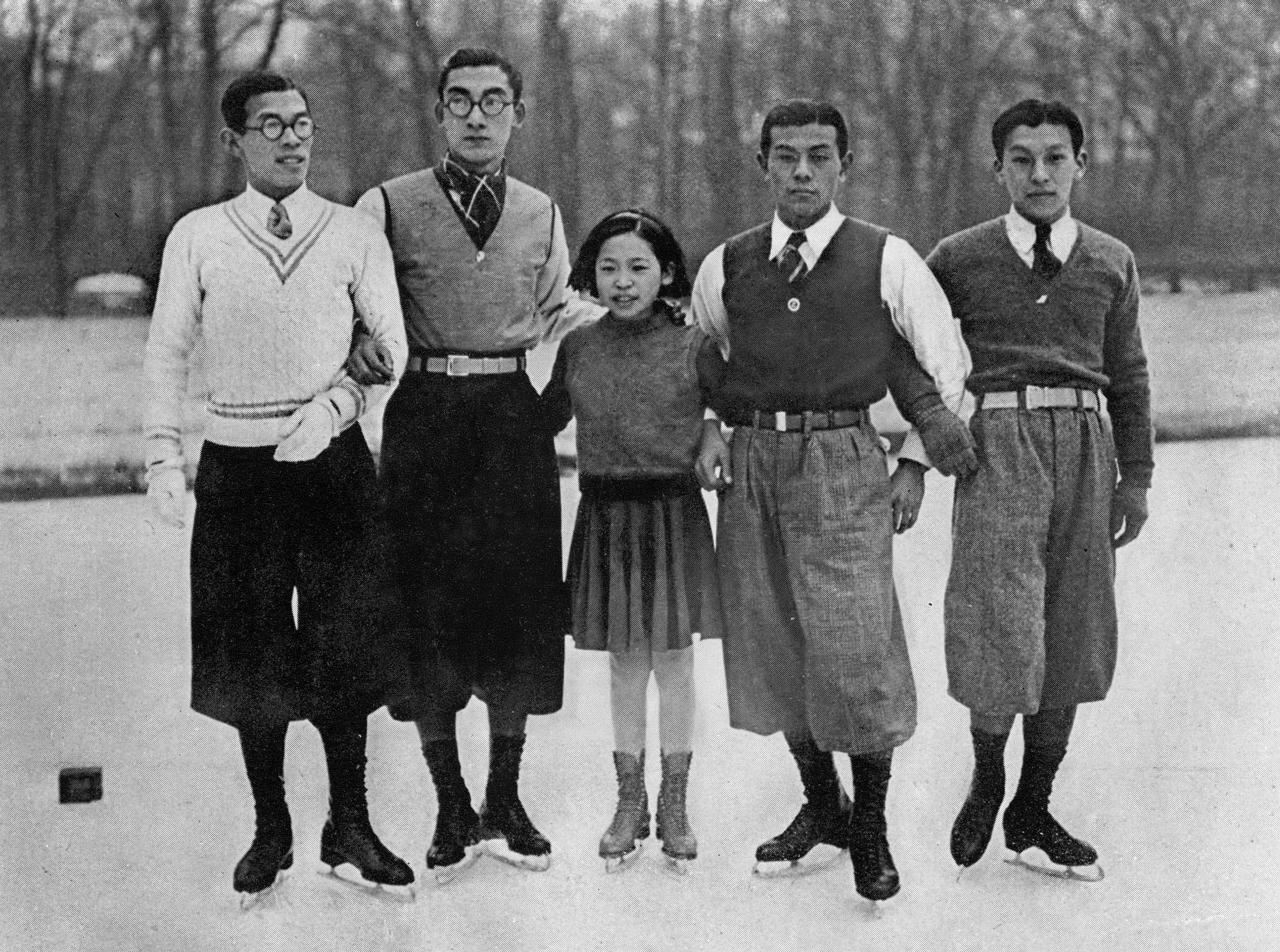 1936年ガルミッシュパルテンキルヘン冬季オリンピック(独逸国)フィギアスケート出場の選手5名 (中央は稲田悦子選手12歳)